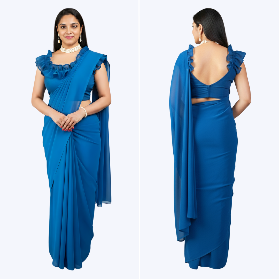 Melifloz Ruffle Neck Saree Ready-to-wear saree with a light weight,perfect drape and a stylish ruffled neck pattern blouse. Manufacturer: Melifloz Availability: In stock SKU: SP-100-SR-GT-A Free shipping Color * Please select Teal Size * Please select Small (S) Medium (M) Large (L) Extra Large (XL) ₹4,900.00 Qty: Add to cart Custom wishlist OK Add to wishlist Add to compare list Email a friend Product DescriptionElevate your formal wardrobe with the Melifloz Ruffle Neck Pre-Stitched Saree, a stunning ensemble that perfectly merges traditional grace with modern ease. Presented in a striking Teal color, this ready-to-wear saree is the epitome of sophisticated chic, designed for the contemporary woman who values both style and convenience.Key FeaturesReady-to-Wear Design: This is a pre-stitched, one-minute saree, eliminating the need for complex pleating and draping. Simply slip it on like a skirt and secure the pallu for a flawless, impeccably draped look every single time.Signature Ruffle Neck Blouse: The saree is paired with a beautifully tailored blouse featuring an eye-catching ruffle detail along the neck and shoulder line, adding a playful yet sophisticated dimension to the classic silhouette.Flattering Drape: Crafted from a lightweight, flowing fabric (Premium Georgette), the material cascades elegantly to create a sleek, slimming, and graceful silhouette.Modern Back Detailing: The blouse boasts a deep V-cut back, offering a contemporary and alluring twist to the traditional garment.Vibrant Color: The solid, Teal color is classic, commanding attention and serving as a perfect canvas for your favorite jewelry.Occasion DetailsThe Melifloz Ruffle Neck Saree is an ideal choice for formal and semi-formal occasions where you want to make a polished, memorable statement with minimal effort.Perfect For: Cocktail parties, evening receptions, corporate galas, upscale dinner events, wedding guest attire, and formal holiday gatherings.Styling Note: Its clean lines and sophisticated ruffle detail make it a versatile piece that can be paired with classic pearl accessories for timeless elegance or modern statement jewelry for a high-fashion look.